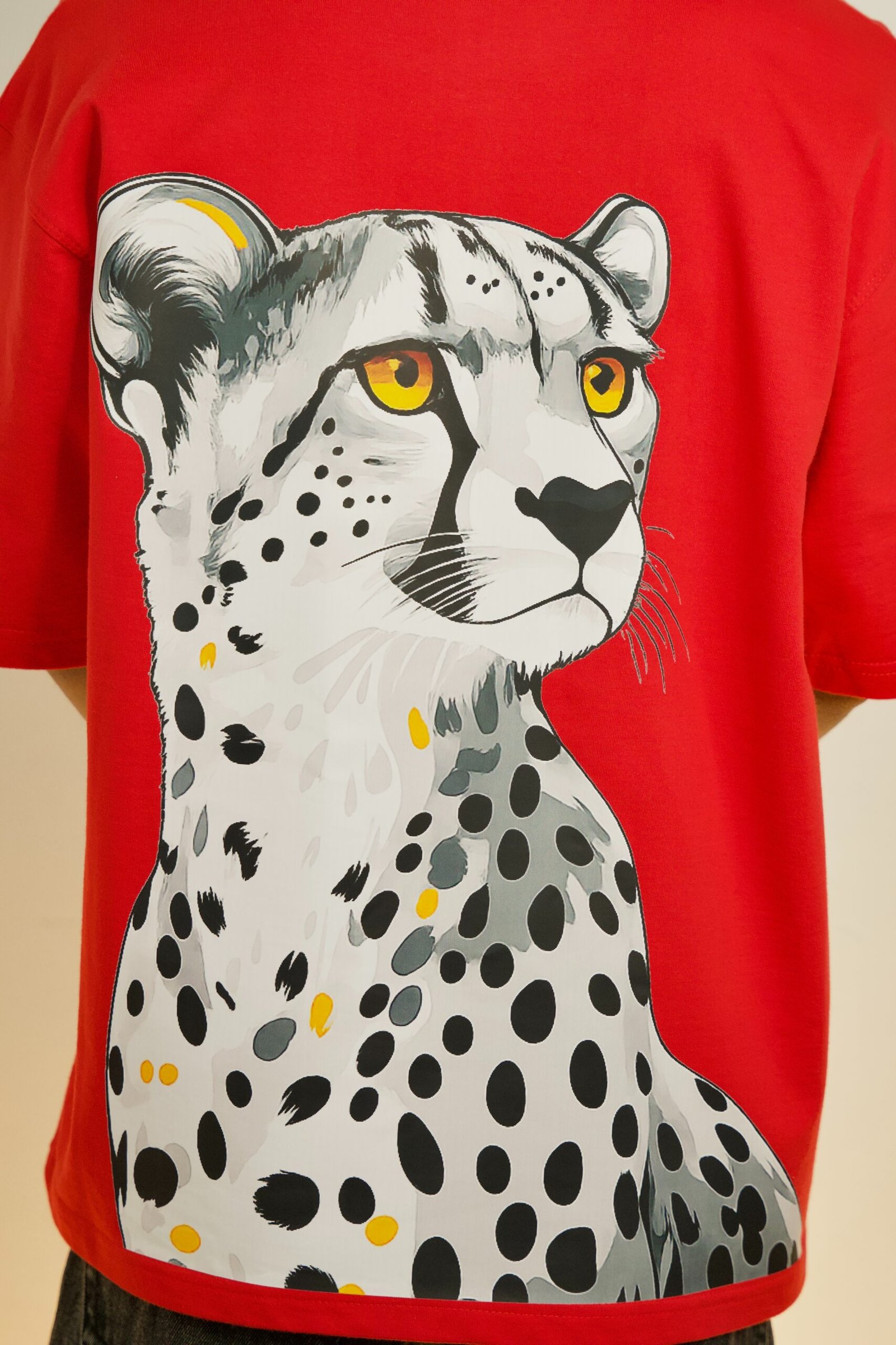 Pair this Cheetah graphic tee with black cargo pants, dark distressed denim, or relaxed joggers for a high-contrast streetwear look. Finish the outfit with chunky black or white sneakers and minimal accessories to let the vibrant red fabric and fierce back graphic take center stage.
