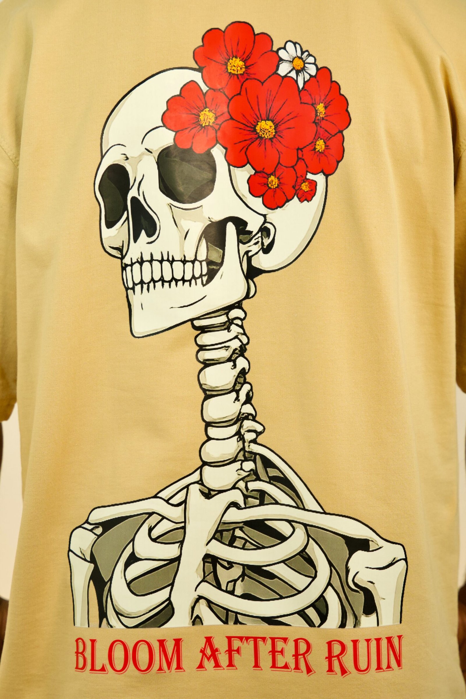 Bring a bold and artistic vibe to your streetwear collection with the Floral Skull Graphic Oversized T-Shirt. Featuring a stunning back print of a classic skull silhouette intricately adorned with vibrant red floral patterns, this design combines modern street fashion with creative gothic-inspired artwork. The detailed skeleton graphic gives the T-shirt a unique and eye-catching appearance that stands out in any crowd.