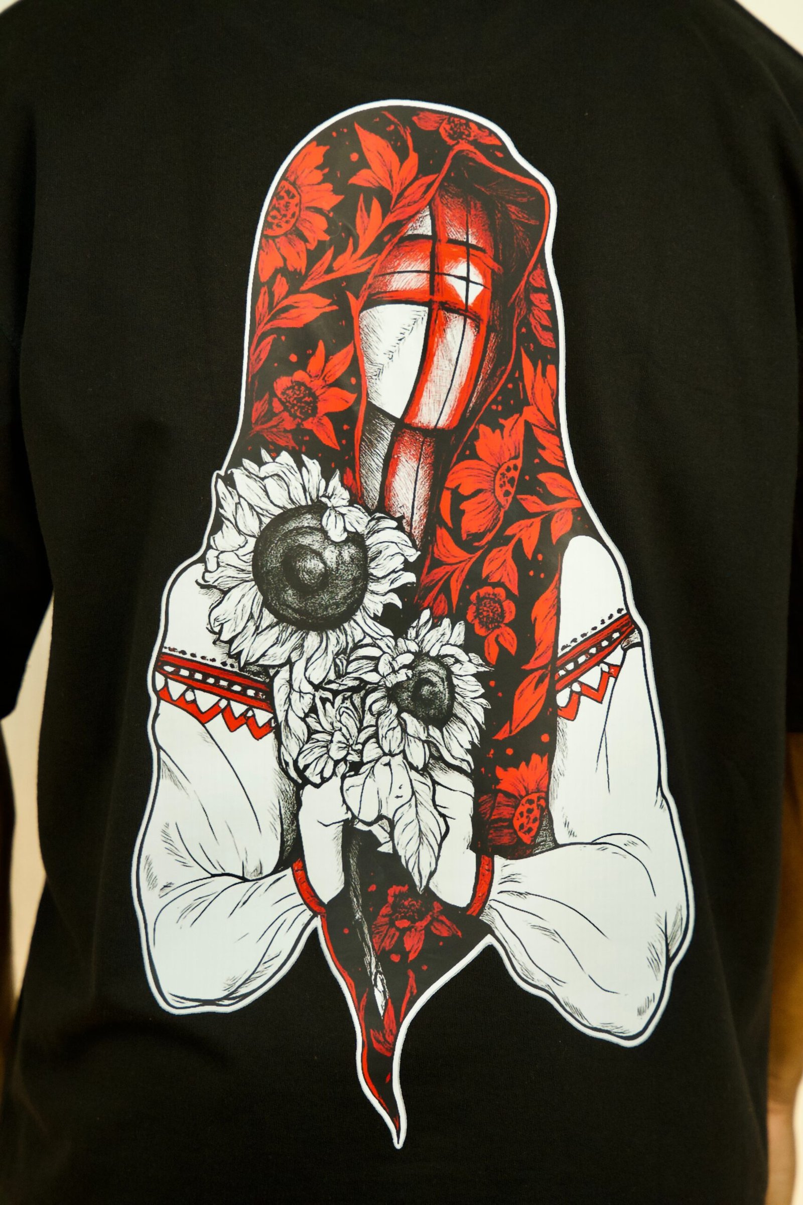 Bring a bold and artistic vibe to your streetwear collection with the Mystic Hooded Floral Graphic Oversized T-Shirt. Featuring a stunning back print of a hooded figure adorned with intricate red floral patterns and sunflowers, this design combines modern street fashion with creative, gothic-inspired artwork. The detailed and mysterious graphic gives the T-shirt a unique and eye-catching appearance that stands out in any crowd.